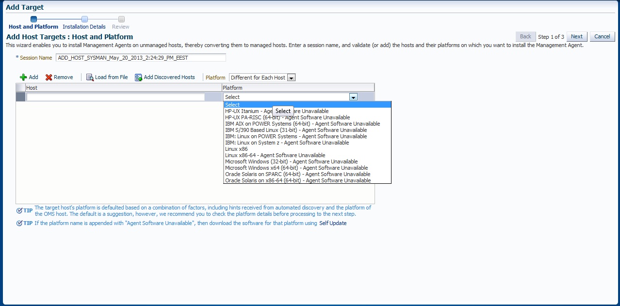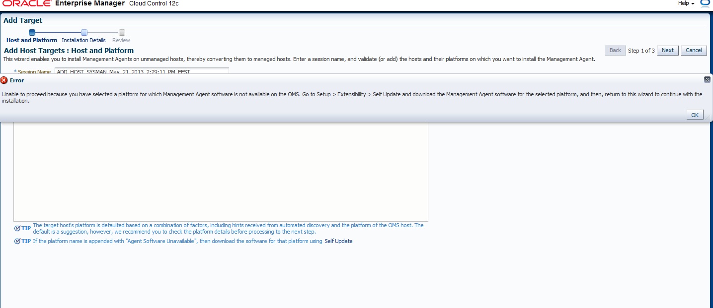 Sometimes you need to deploy new agent to different machine or database, and to do that you have to add target and choose which platform installed but Agent software unavailable this is the message you will see.