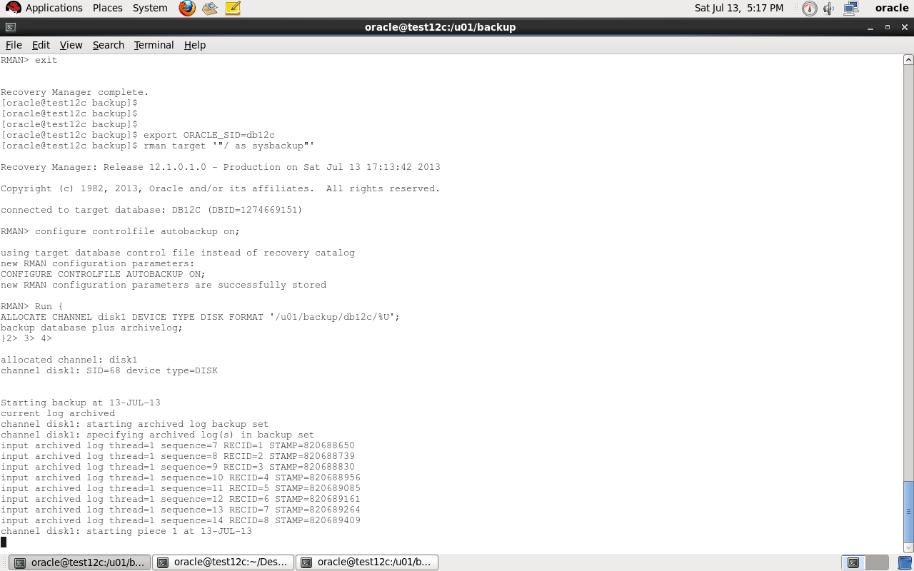 Recovery Manager: Release 12.1.0.1.0 – Production on Sat Jul 13 17:13:42 2013