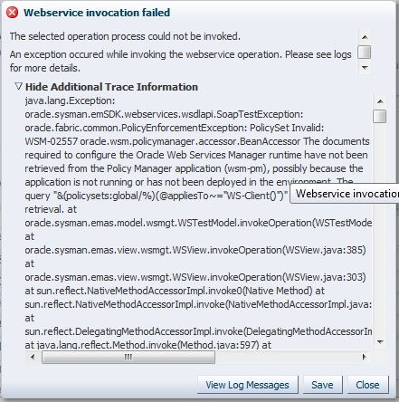 hi osama, Testing a web service(in EM) which is deployed in admin server .Home >Summary of Security Realms >myrealm >Users and Groups > OracleSystemUser is listed and DefaultAuthenticator is the provider for that user. but still am getting below error . please help me out.java.lang.Exception: oracle.sysman.emSDK.webservices.wsdlapi.SoapTestException: oracle.fabric.common.PolicyEnforcementException: PolicySet Invalid: WSM-02557 oracle.wsm.policymanager.accessor.BeanAccessor The documents required to configure the Oracle Web Services Manager runtime have not been retrieved from the Policy Manager application (wsm-pm), possibly because the application is not running or has not been deployed in the environment. The query “&(policysets:global/%)(@appliesTo~=”WS-Client()”)” is queued for later retrieval. WSM-02557 oracle.wsm.policymanager.accessor.BeanAccessor The documents required to configure the Oracle Web Services Manager runtime have not been retrieved from the Policy Manager application (wsm-pm), possibly because the application is not running or has not been deployed in the environment. The query “/policies/oracle/wss11_x509_token_with_message_protection_client_policy” is queued for later retrieval. at oracle.sysman.emas.model.wsmgt.WSTestModel.invokeOperation(WSTestModel.java:813) at