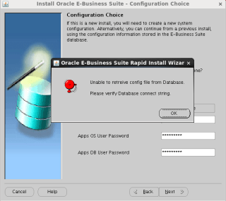 The above error shown up when trying to install APPS and connect it to the RAC/single database to fix this issue Just copy the configuration file after the installation is done successfully under the path :- /ebs1stag/oracle/SEBSDB/12.1.0/appsutil for example the file name usually conf_SEBSDB.txt and load the file, try again.