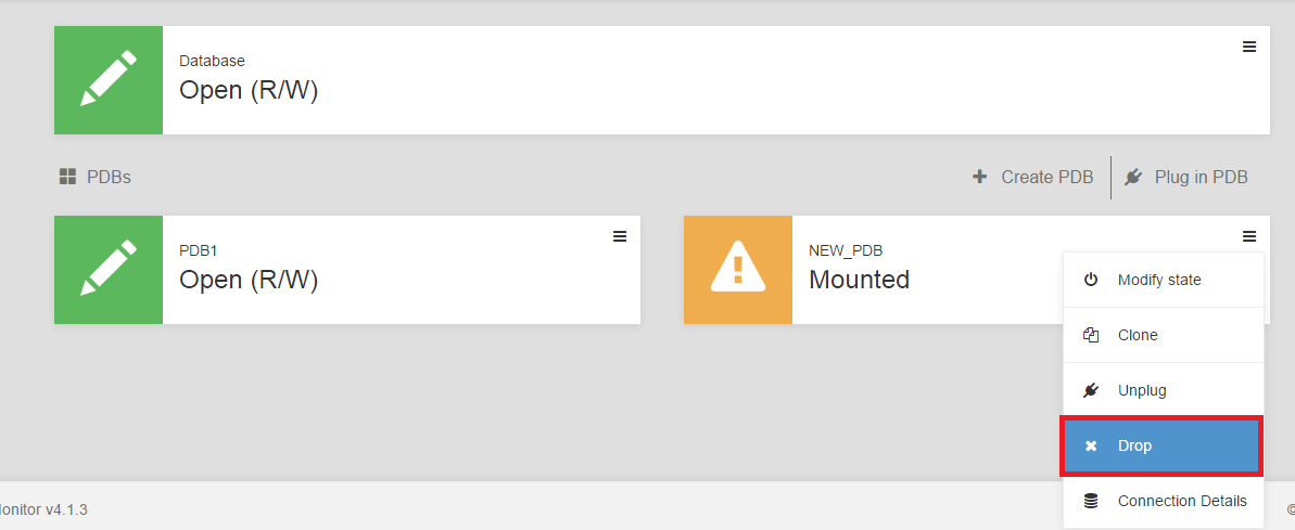 - Same screen you can drop the database by press on the panel then drop like the following, new screen will be opened you can choose keep the datafiles or delete them it’s refer to you