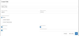 - New Screen will be opened contains different parameters such as the name of the PDB, Password and file name conversion once you enter everything press ok