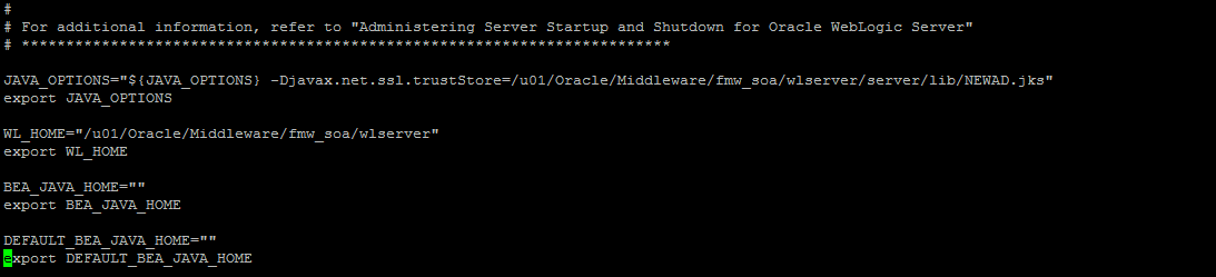 JAVA_OPTIONS=”${JAVA_OPTIONS} -Djavax.net.ssl.trustStore=/u01/Oracle/Middleware/fmw_soa/wlserver/server/lib/NEWAD.jks