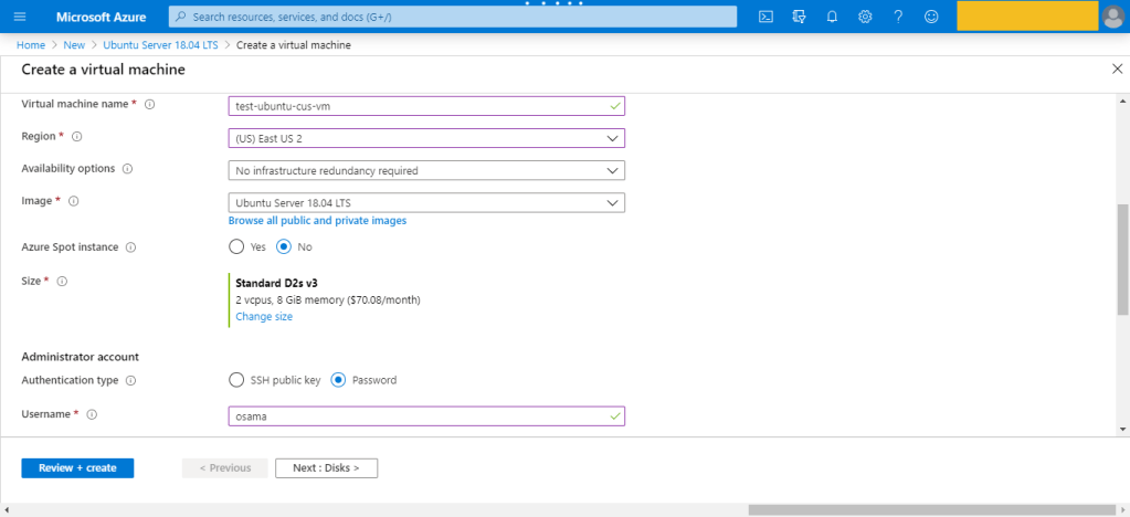 • There are several other tabs you can explore to see the settings you can influence during the VM creation. Once you’re finished exploring, click Review + create to review and validate the settings.