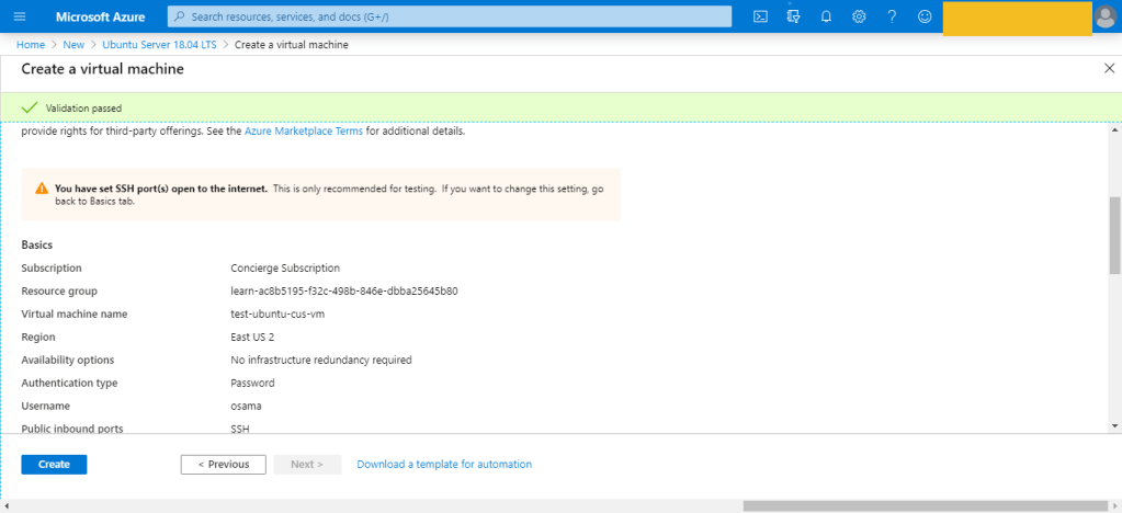 • On the review screen, Azure will validate your settings. You might need to supply some additional information based on the requirements of the image creator.