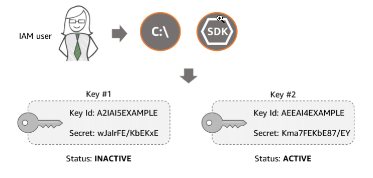 - Users need their own access keys to make programmatic calls to AWS using the AWS CLI, the AWS SDKs, or direct HTTPS calls using the APIs for individual AWS services. Access keys are used to digitally sign API calls made to AWS services. Each access key credential is comprised of an access key ID and a secret key. Each user can have two active access keys, which is useful when you need to rotate the user’s access keys or revoke permissions.