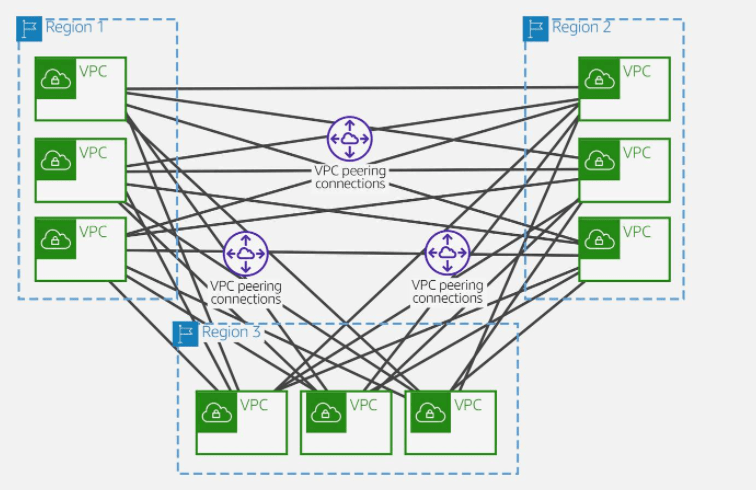 Suppose a customer has multiple VPCs in three different Regions. As the following diagram illustrates, to permit network traffic to route between each VPC requires creating 72 VPC peering connections. Each VPC needs 8 different routing configurations and security policies.