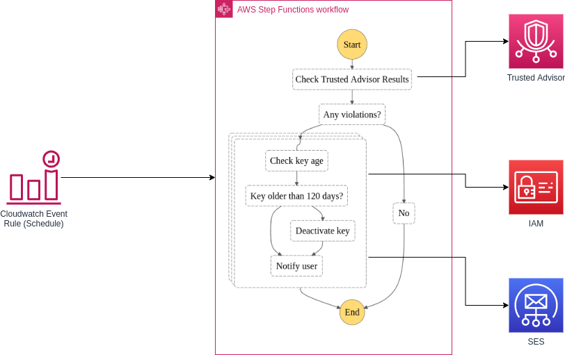 This solution deploys a step functions workflow that is designed to detect user IAM access keys that are older than 90 days. It will send out an email notification to the affected user every day until it is resolved. For access keys older than 120 days, the key will be deactivated.
