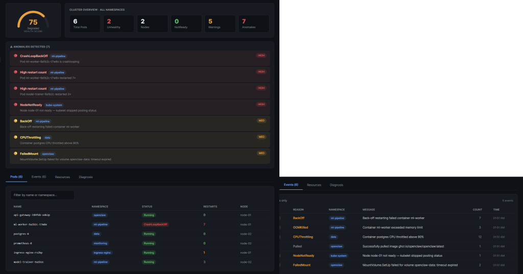 What I wanted was something simpler. A single view of the entire cluster, automatic detection of anything that looks wrong, and an AI that could look at the same data an experienced SRE would look at and tell me what is happening in plain English.